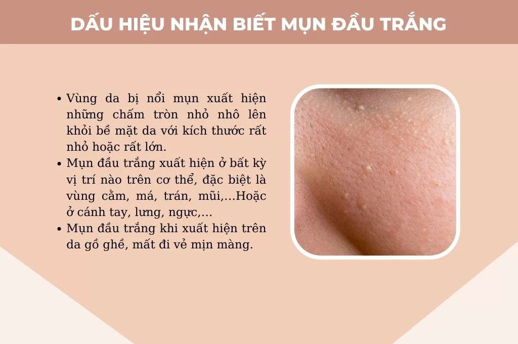Mụn đầu trắng là một loại mụn nằm dưới da và được bao phủ bởi một lớp biểu bì mỏng. Điều này làm cho mụn không bị oxy hóa và giữ nguyên màu trắng, không tiếp xúc với không khí. Đây là sự khác biệt chính giữa mụn đầu trắng và mụn đầu đen, loại mụn có đầu đen do bị oxy hóa khi tiếp xúc với không khí.